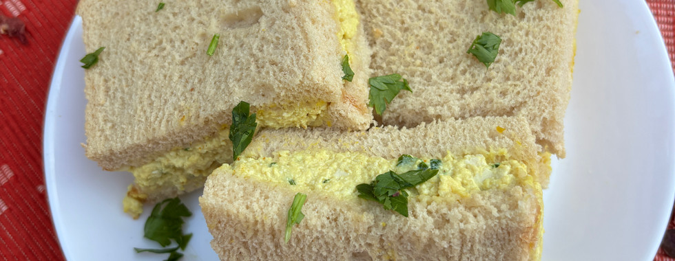 Cut the crusts off of four slices of white bread and scoop the filling between two slices of bread. Cut into bite-sized pieces and enjoy!
